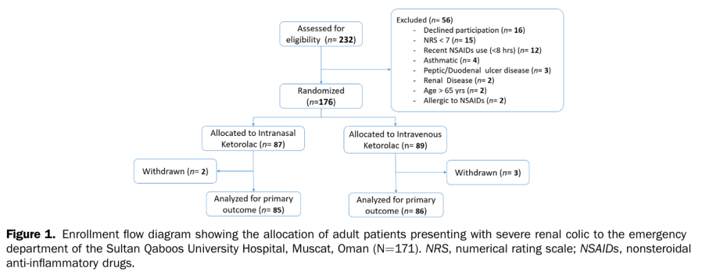 2. Al-Khalasi USS, Al-Alalawi AKSAS, Al-Jufaili M, et al. Atomized Intranasal Ketorolac Versus Intravenous Ketorolac for the Treatment of Severe Renal Colic in the Emergency Department: A Double-Blind, Randomized Controlled Trial. Ann Emerg Med. 2024;83(3):217-224. doi:10.1016/j.annemergmed.2023.10.009