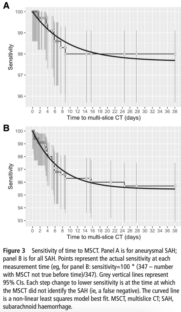 Of the 347 patients with SAH, 260 were aneurysmal SAH – of note this paper included very few patients who had scans beyond 24 hours so the authors recommended caution in interpretation of the very high sensitivity found for time windows greater than 24 hours.